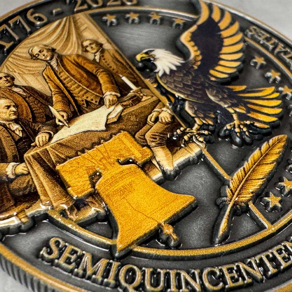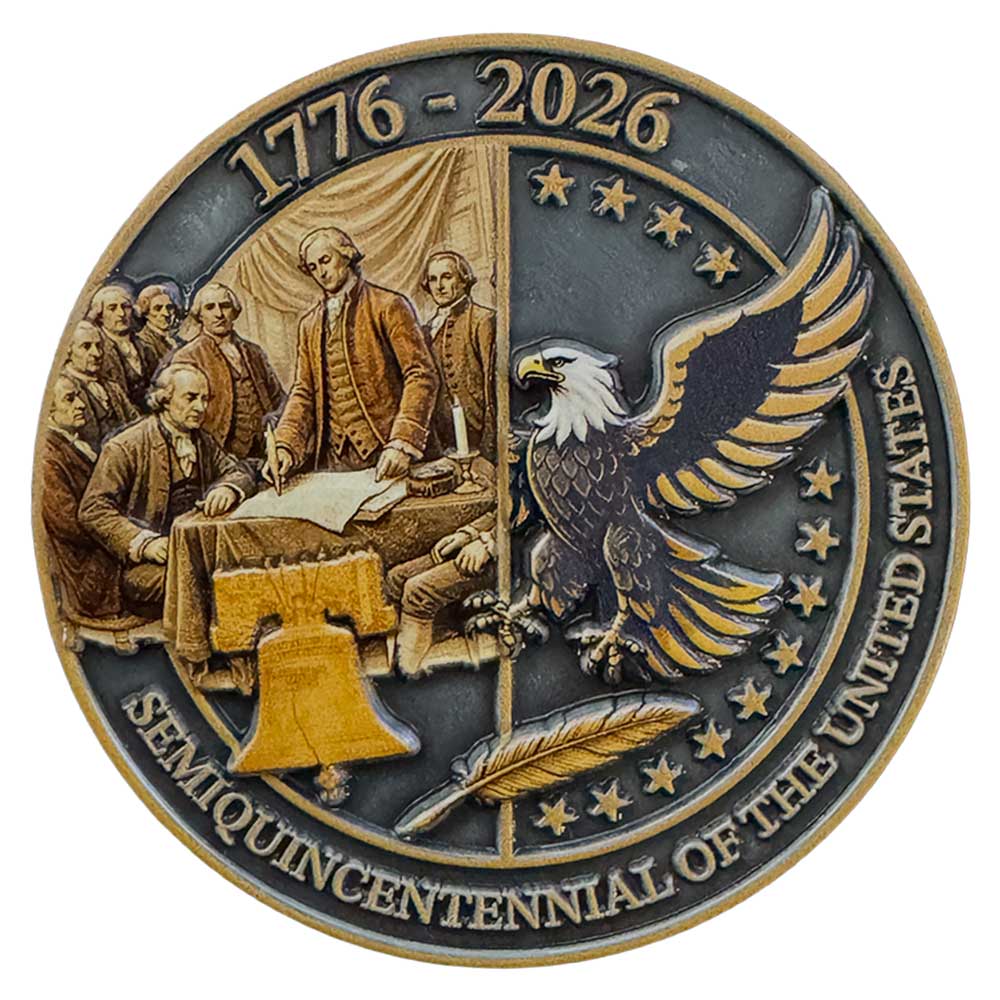 The front of the coin features a powerful collection of American history brought together in one design. The American Bald Eagle stands as a symbol of strength and freedom. The Liberty Bell represents independence and the birth of a nation. A detailed depiction of the Signing of the Declaration of Independence honors the moment that changed the world. Surrounding these elements are 13 stars, representing the original colonies, along with a feather pen, symbolizing the instrument that put freedom into writing. Anchoring the design are the dates 1776–2026 and the wording Semiquincentennial of the United States, marking this once in a lifetime celebration.