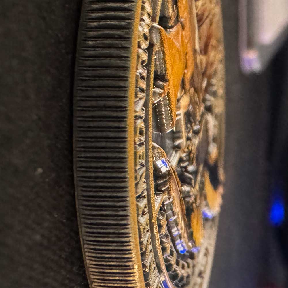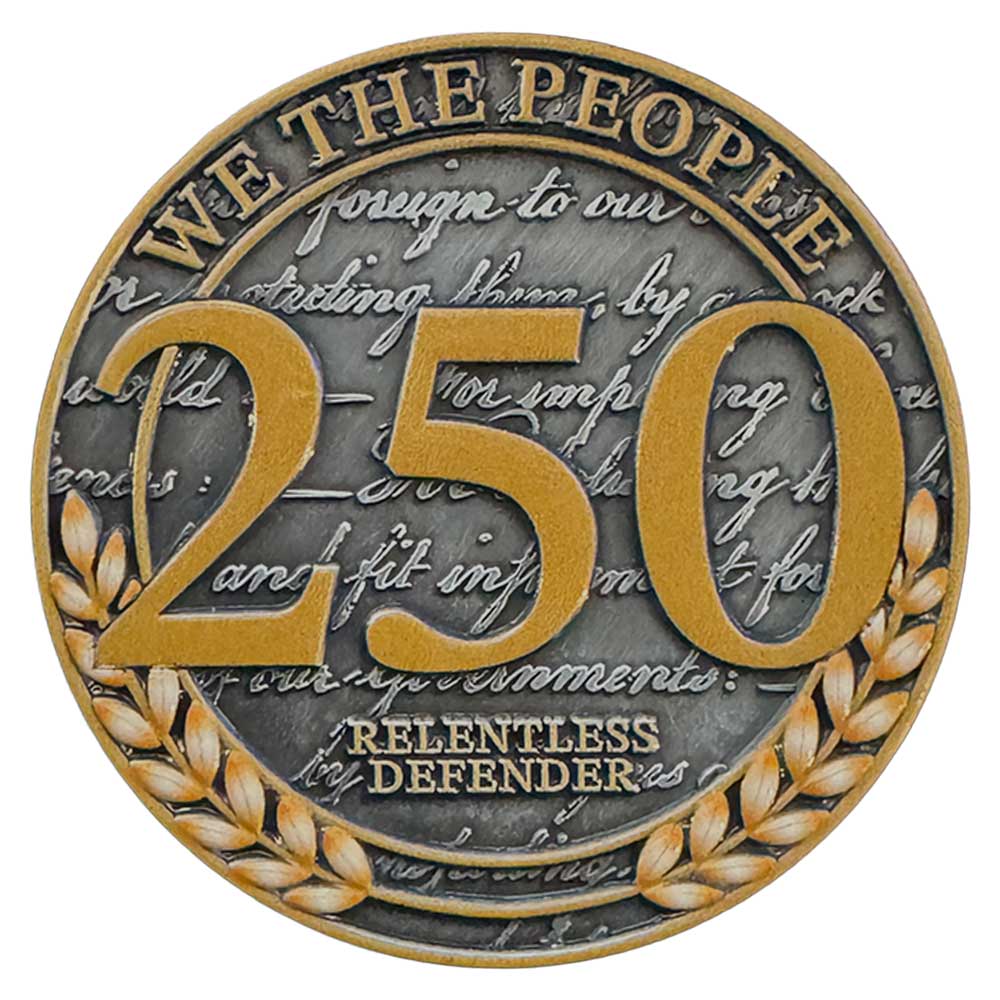 The reverse side of the coin continues the tribute with bold simplicity. The number 250 is prominently displayed, representing the nation’s milestone anniversary. Above it reads “We the People,” a powerful reminder of the foundation of American governance. In the background, a faint overlay of the Declaration of Independence text adds depth and historical significance, tying the entire design back to the principles that started it all.