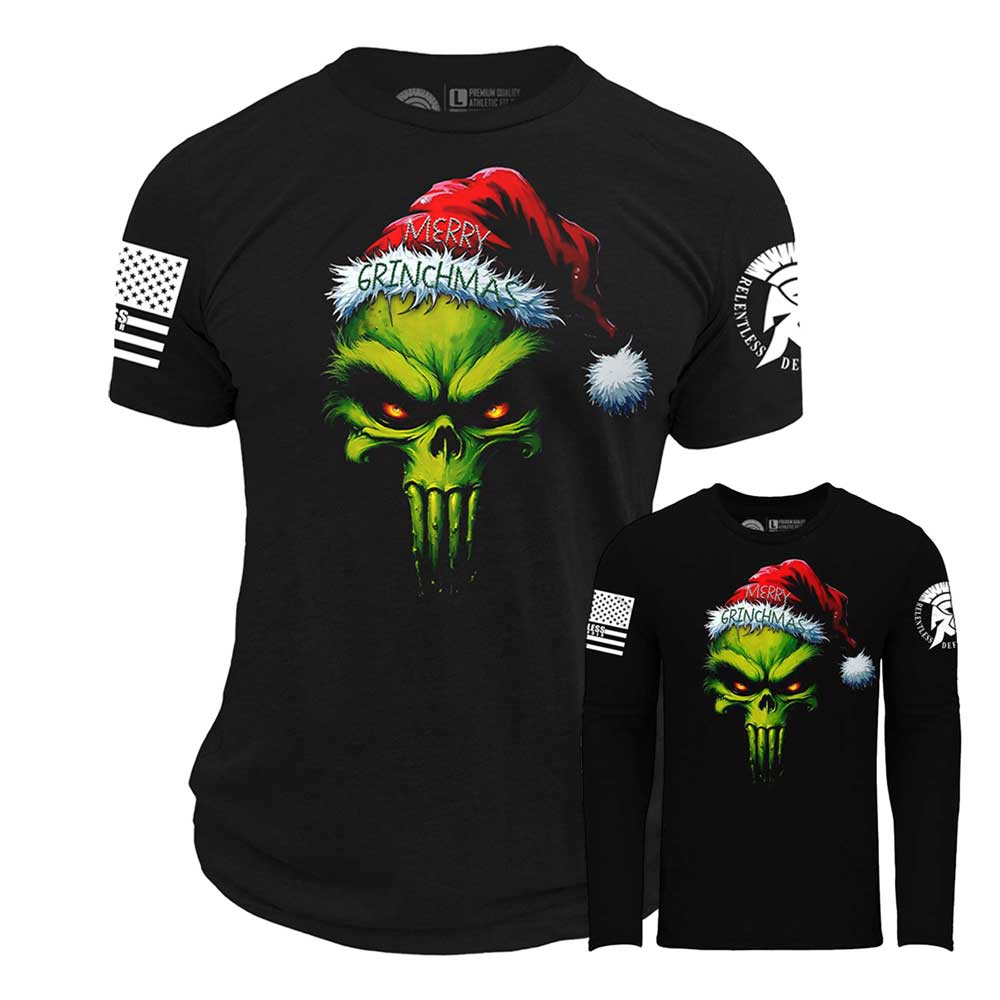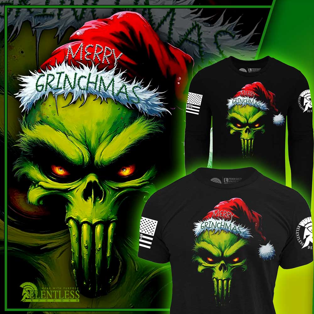 Twist to your holiday wardrobe with the exclusive “Merry Grinchmas” graphic design from Relentless Defender Apparel! This fun and bold design combines two iconic figures—the Grinch and the Punisher—in a clever parody that’s sure to make you stand out this holiday season.