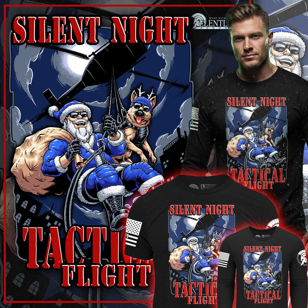Relentless Defender proudly presents Silent Night, our annual Blue Santa design that brings holiday spirit together with tactical grit. This year’s edition delivers an action packed twist on a classic favorite. Blue Santa is fully geared up and rappelling from a helicopter, dropping in with precision to deliver gifts in true operator style. At his side is his loyal K9 partner, standing in as a tactical reindeer and ready for the mission.
