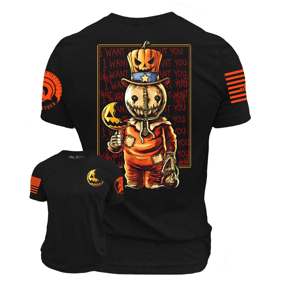 This clever mash-up captures the essence of both characters: Sam’s quiet, rule-enforcing menace and Uncle Sam’s commanding presence. The result? A design that’s perfect for fans of cult horror films, dark humor, and seasonal scares. Whether you’re heading to a haunted house, passing out candy, or just want to show off your Halloween spirit with a bit of an edge, this shirt delivers both fright and fun.